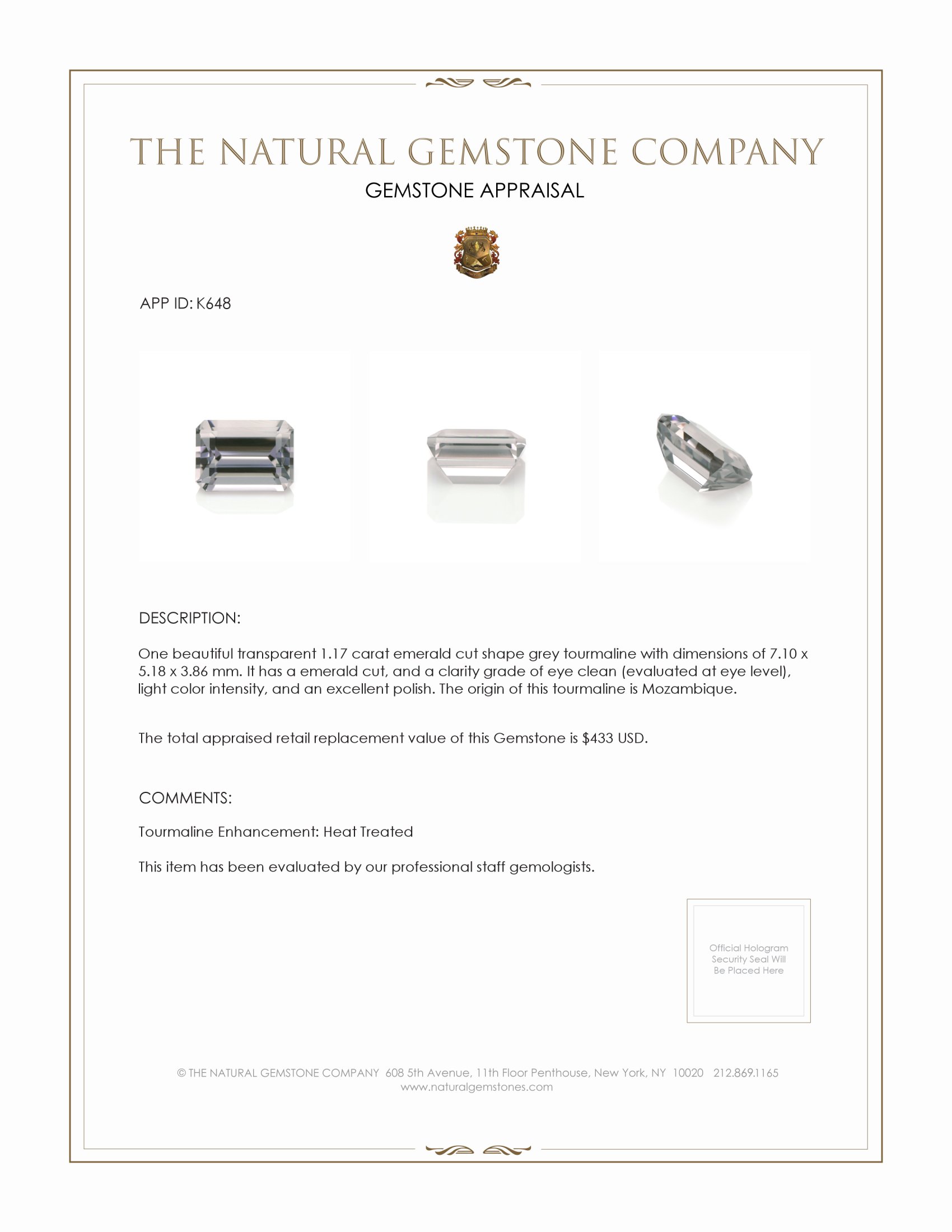 The Natural Gemstone Company proudly presents a truly exquisite creation: a 1.17 carat emerald-cut grey tourmaline, meticulously sourced from the renowned mines of Mozambique. This gemstone, with its precision-cut dimensions of 7.10 x 5.18 x 3.86 mm, showcases the unparalleled craftsmanship inherent in an emerald cut. The cut itself is known for its ability to enhance the gem's luster and brilliance, while maintaining an air of timeless elegance. This bespoke piece is characterized by its eye-clean clarity, a feature that means it exhibits no inclusions visible to the naked eye, ensuring that the stone remains as captivating as it does pristine.