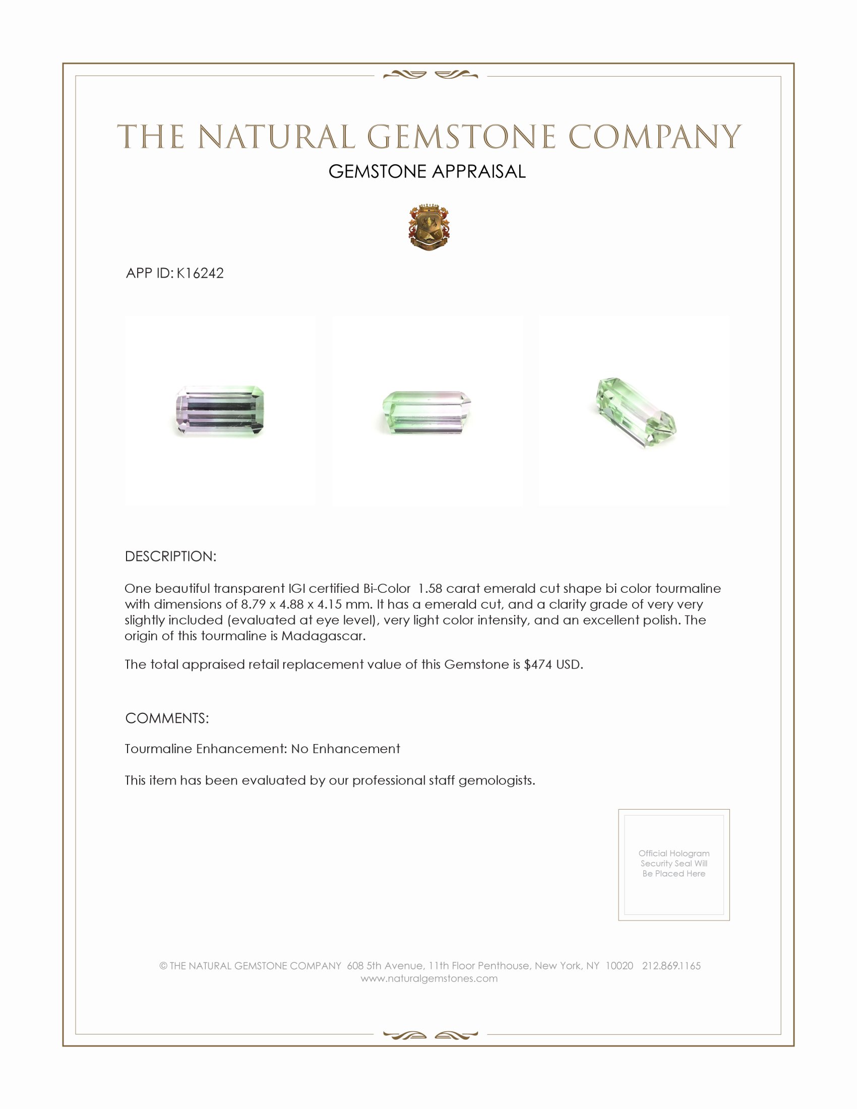 To conclude, this 1.58 carat emerald cut bi color tourmaline from Madagascar stands as a rare offering from The Natural Gemstone Company, a natural gem with dimensions 8.79 x 4.88 x 4.15 mm, clarity graded very very slightly included at eye level, very light color intensity, excellent polish, and no enhancement. It carries the quiet nobility of traditional use and the refined modernity of precise cutting, a bridge between heritage and contemporary bespoke jewelry. For the collector who values authenticity and rarity, this tourmaline is an invitation to join a small circle of owners who can claim a gem of distinct character. If you wish to explore design possibilities, request private viewing, or receive further details, our team will be pleased to assist with the discretion and expertise this stone deserves.