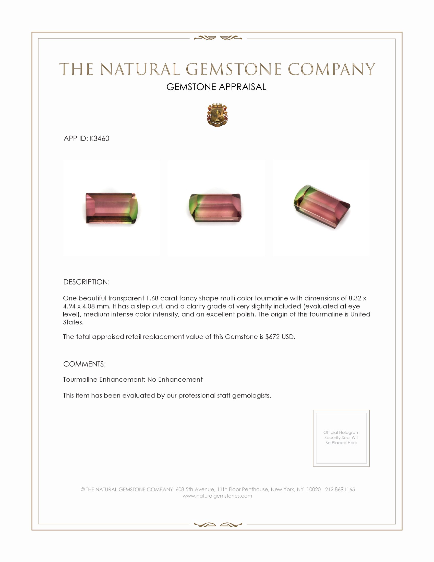 At The Natural Gemstone Company, we take pride in presenting a truly exquisite gem that embodies both beauty and rarity, a transparent 1.68 carat fancy shape multi-color tourmaline. With dimensions of 8.32 x 4.94 x 4.08 mm, this gemstone is a marvel of nature, designed to captivate and enchant. The meticulous step cut enhances its natural allure, revealing the incredible play of colors and the meticulous attention to detail that went into crafting this remarkable piece. The excellence of its finish is a testament to the craftsmanship and precision that The Natural Gemstone Company is renowned for.