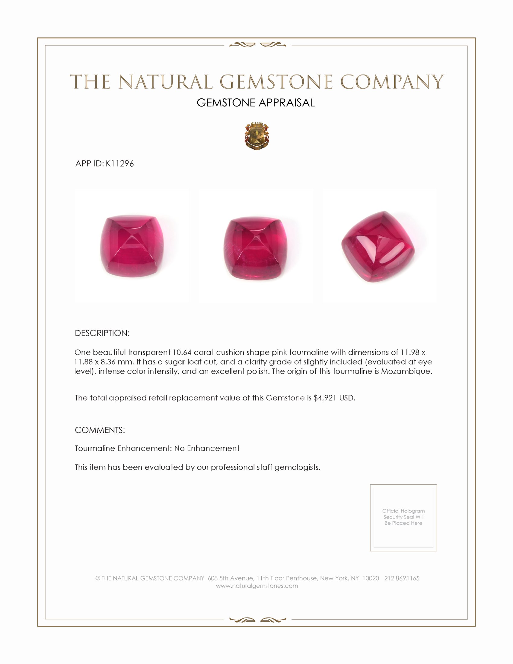 Discover the elegance and allure of our exquisite pink tourmaline, a stone that embodies both vibrant beauty and timeless sophistication. Presenting a remarkable 10.64 carat cushion-shaped pink tourmaline that will capture hearts and turn heads, The Natural Gemstone Company invites you to end your search for the perfect gemstone right here. This captivating piece, with its perfect sugarloaf cut, showcases the mastery of gem craftsmanship. Whether you seek a dazzling centerpiece for an engagement ring or a precious addition to your gemstone collection, this pink tourmaline promises to fulfill your desires.