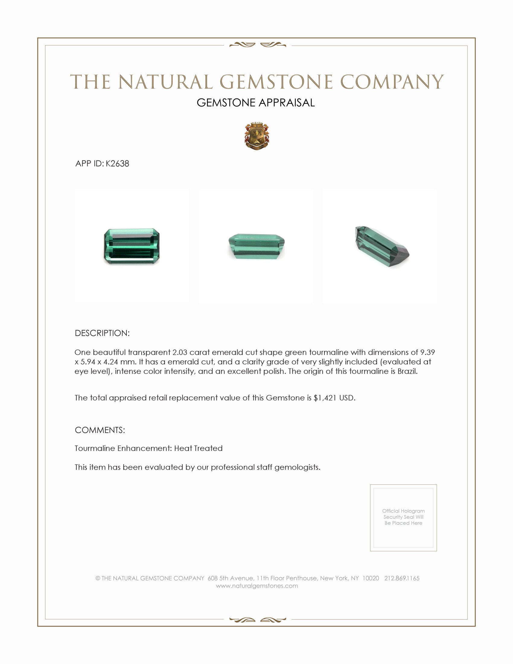 At The Natural Gemstone Company, we present an exquisite treasure that captures the eye and captivates the heart. This exceptional green tourmaline is a testament to nature's artistry, demonstrating rarity in both size and color. With a carat weight of 2.03 and an emerald cut shape, this gemstone measures 9.39 by 5.94 by 4.24 mm, making it a standout choice in any collection. The tourmaline's intense color intensity exudes a captivating allure, ensuring it remains a focal point for admirers and collectors alike.