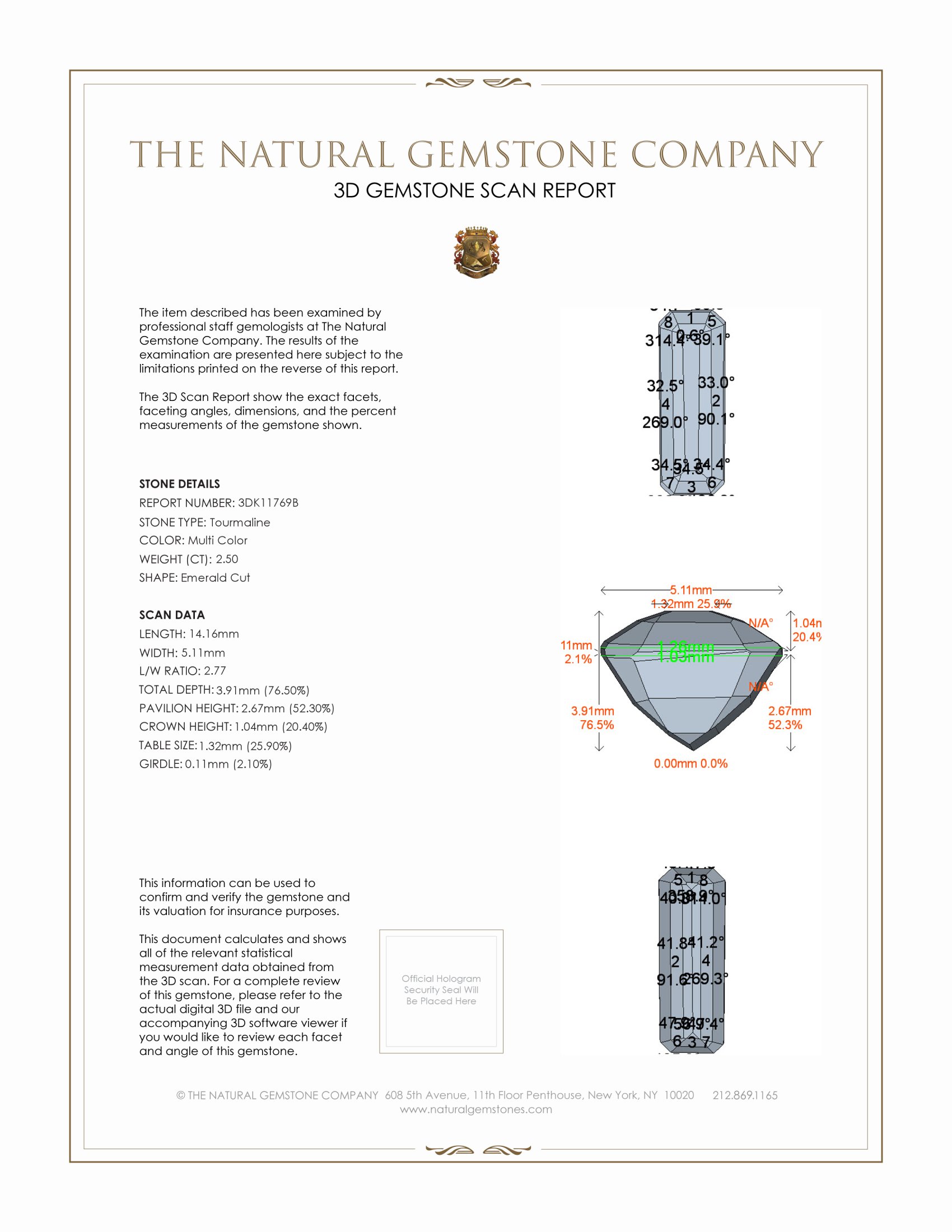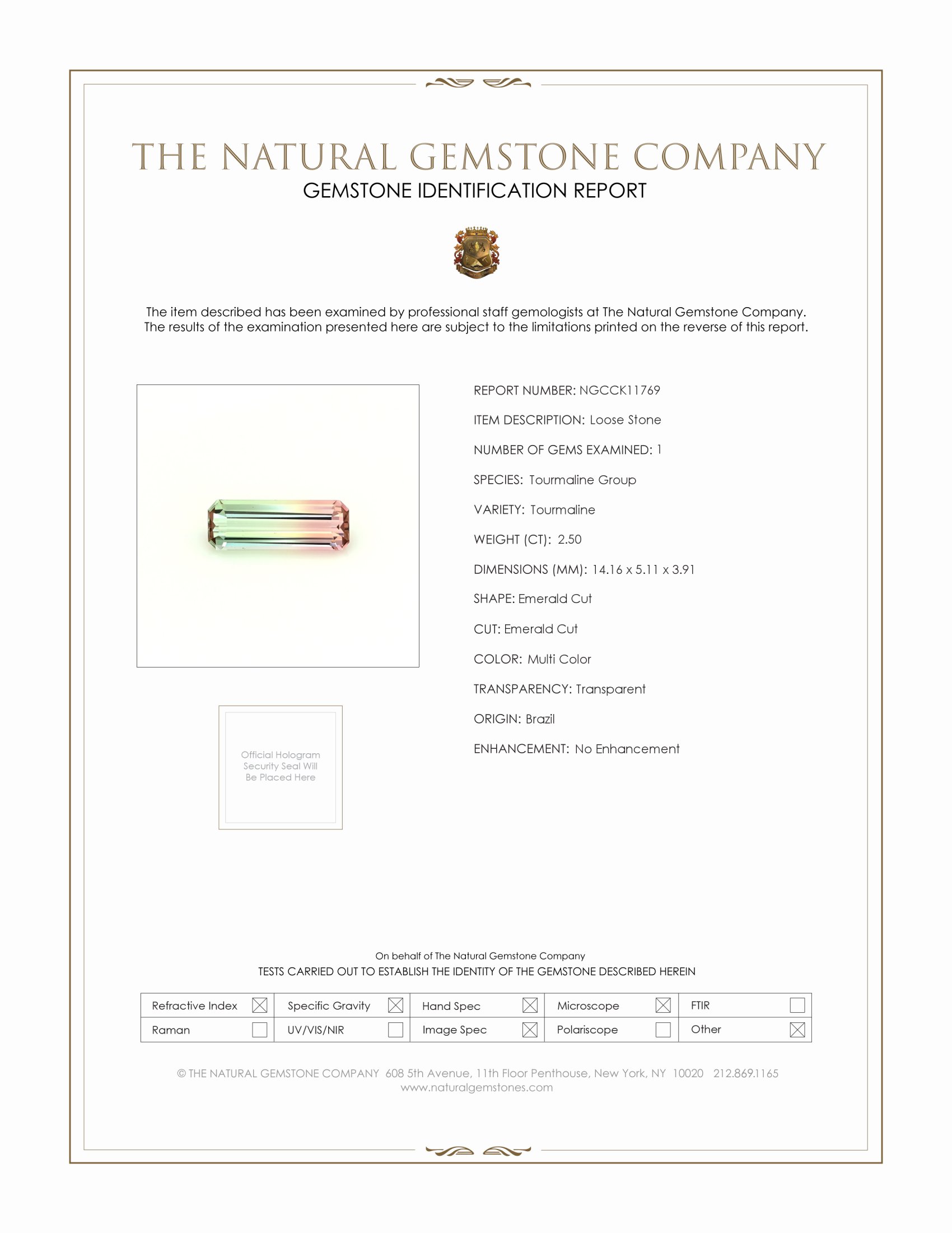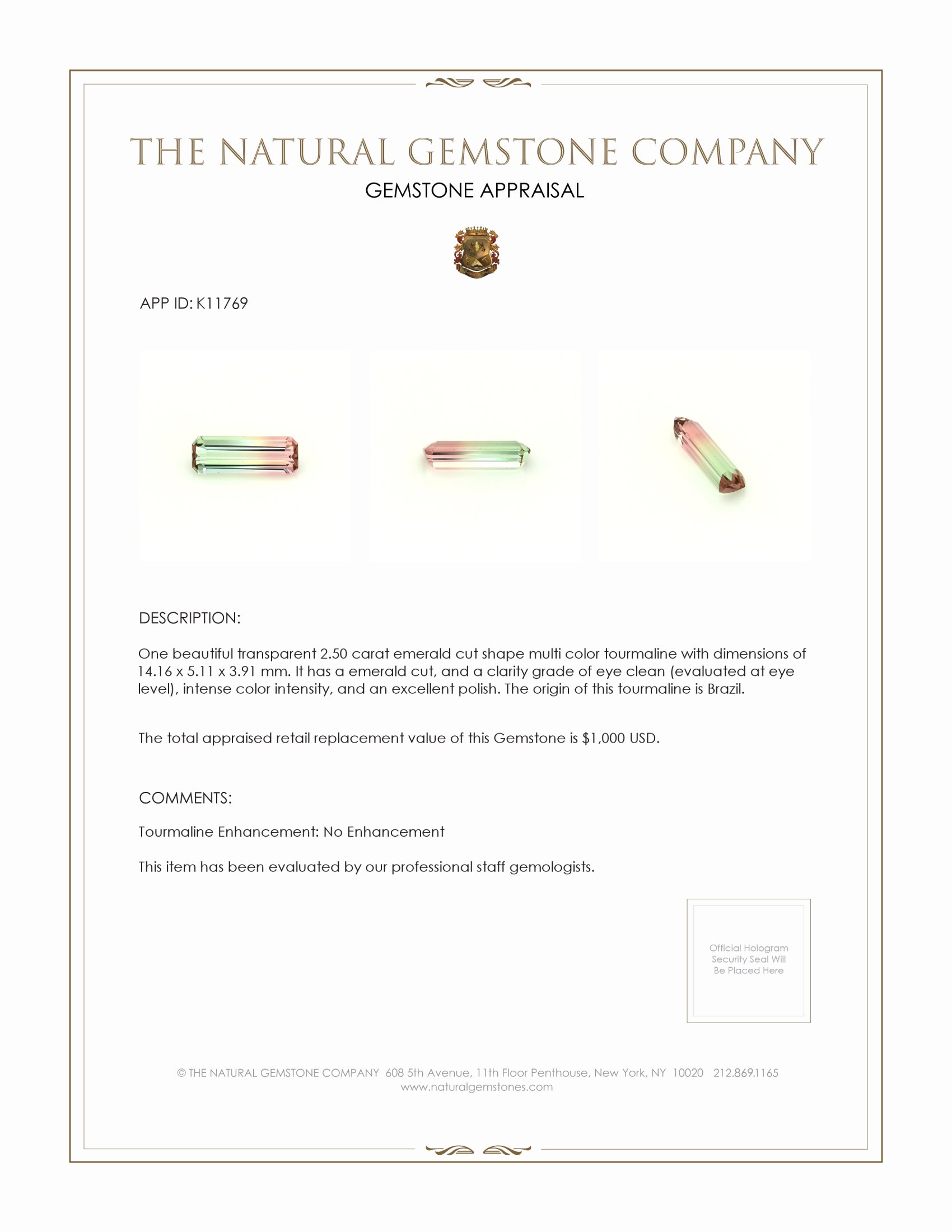 Discover the gem that sets you apart from the ordinary, a rare treasure from the heart of Brazil that beckons the discerning eye of true connoisseurs. The Natural Gemstone Company is pleased to present an exquisite tourmaline unlike any other, a masterpiece of nature destined for the elite. This 2.50-carat emerald cut tourmaline, with its impeccable transparency and intense color intensity, exemplifies the beauty of rarity and the privilege of ownership. Measuring 14.16 x 5.11 x 3.91 mm, its dimensions promise to capture light in a brilliant dance, highlighting the kaleidoscope of hues for which tourmalines are celebrated. Finished with an excellent polish and graced by an eye clean clarity grade, this gem is the epitome of quality and precision.