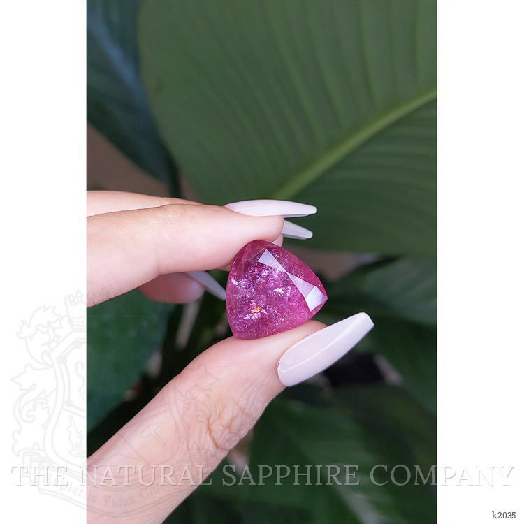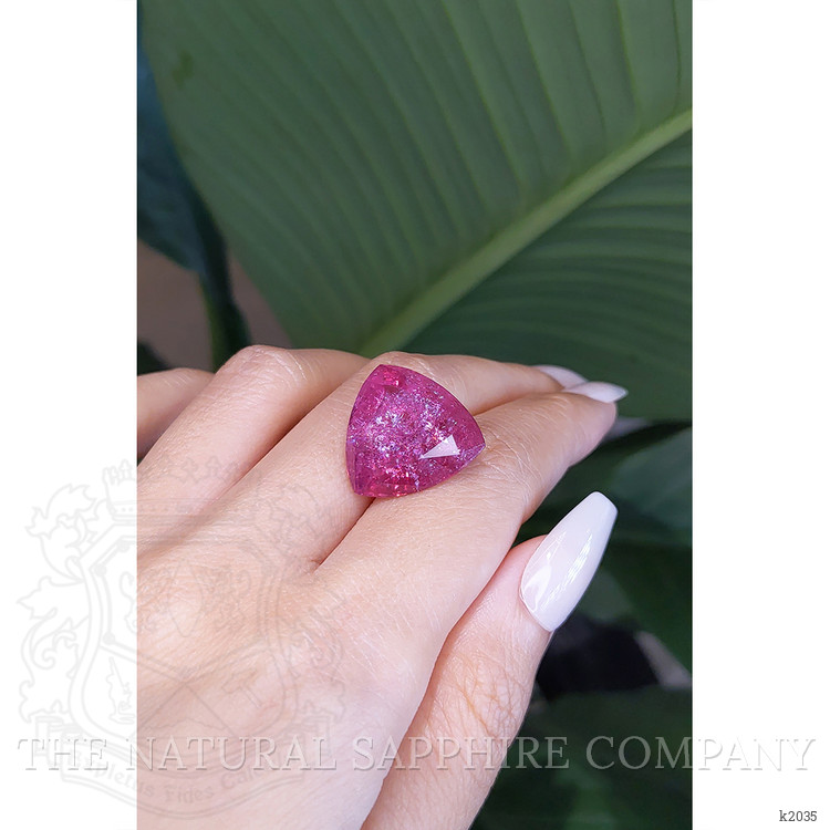 Worked into a stunning 22.29 carat trillion shape, this tourmaline dazzles the eye with its intricate symmetry and perfect lines that embody the bespoke craftsmanship it is endowed with. With dimensions measuring 19.38 x 19.13 x 11.10 mm, its majestic form pronounces its presence with authority, holding the gaze and illuminating the minds of connoisseurs who appreciate the sublime. The trillion cut amplifies the gemstone's internal fire, letting light dance across its surface, creating a tapestry of shifting hues that echo the tenderness and passion of a sunset captured in stone.