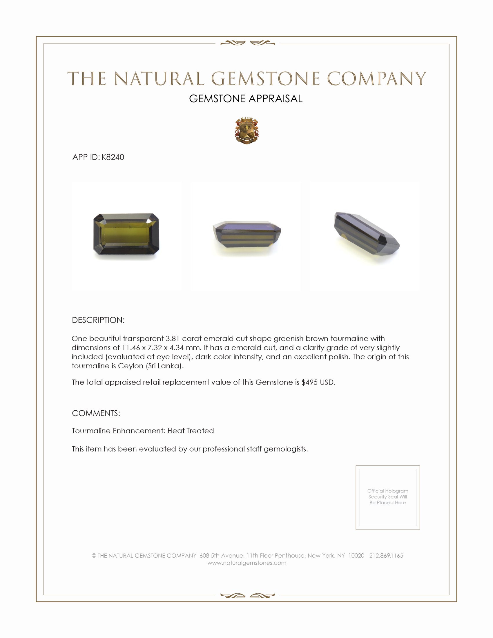 Introducing a remarkable gemstone meticulously crafted for connoisseurs who value precision and unparalleled artistry. Presenting the 3.81 carat greenish brown tourmaline from The Natural Gemstone Company. This exquisite gem stands out not only for its emerald cut shape but also for its rich, bold hue, which symbolizes personal power and distinction. With dimensions measuring 11.46 x 7.32 x 4.34 mm, this tourmaline captures both attention and admiration through its striking presence.