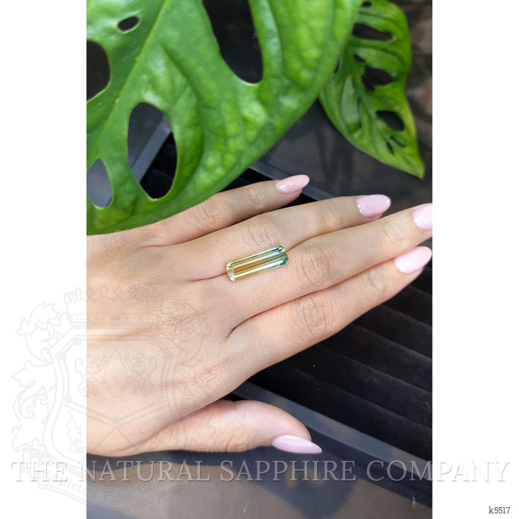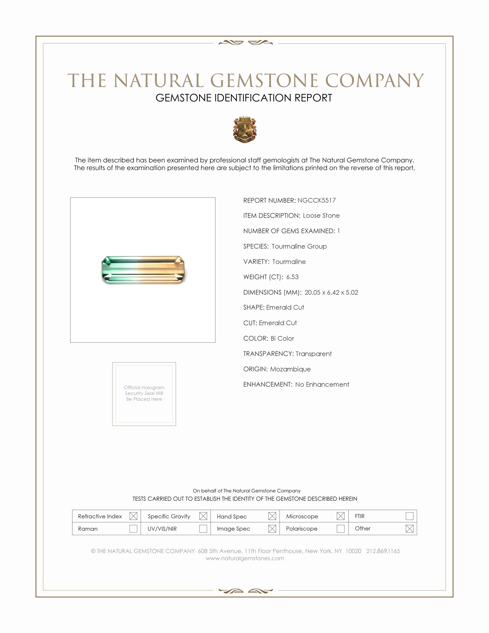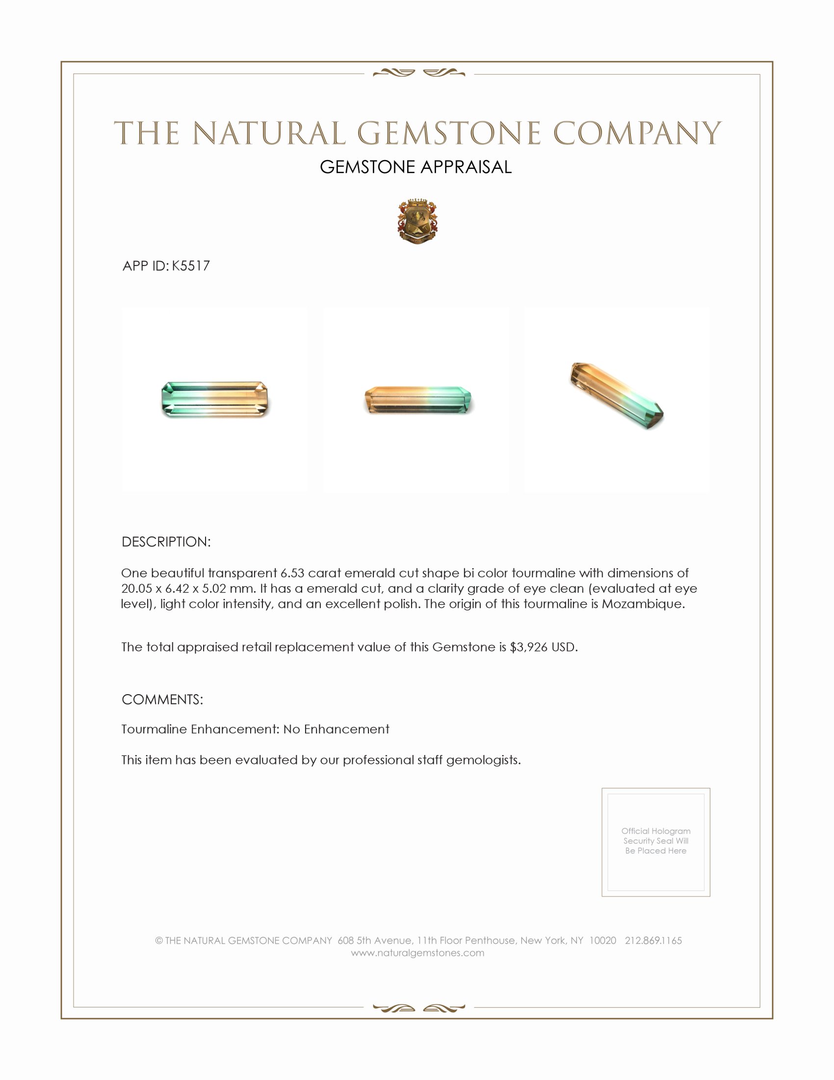 The exquisite bi-color tourmaline offered by The Natural Gemstone Company stands as a testament to both nature's artistry and human craftsmanship. Weighing in at an impressive 6.53 carats, this transparent gemstone boasts an emerald cut, measuring precisely 20.05 by 6.42 by 5.02 mm. Its faceting style, the revered emerald cut, has been cherished throughout history for its ability to emphasize clarity and color through step-cut facets, making it synonymous with elegance and sophistication. This cut is comparable to the legendary Colombian emeralds, which gained fame during the early conquests for their vibrant hues and clarity. Yet, this tourmaline has its own unique charm, with a bi-color display that offers a stunning visual contrast and intrigue rare even among famous stones.