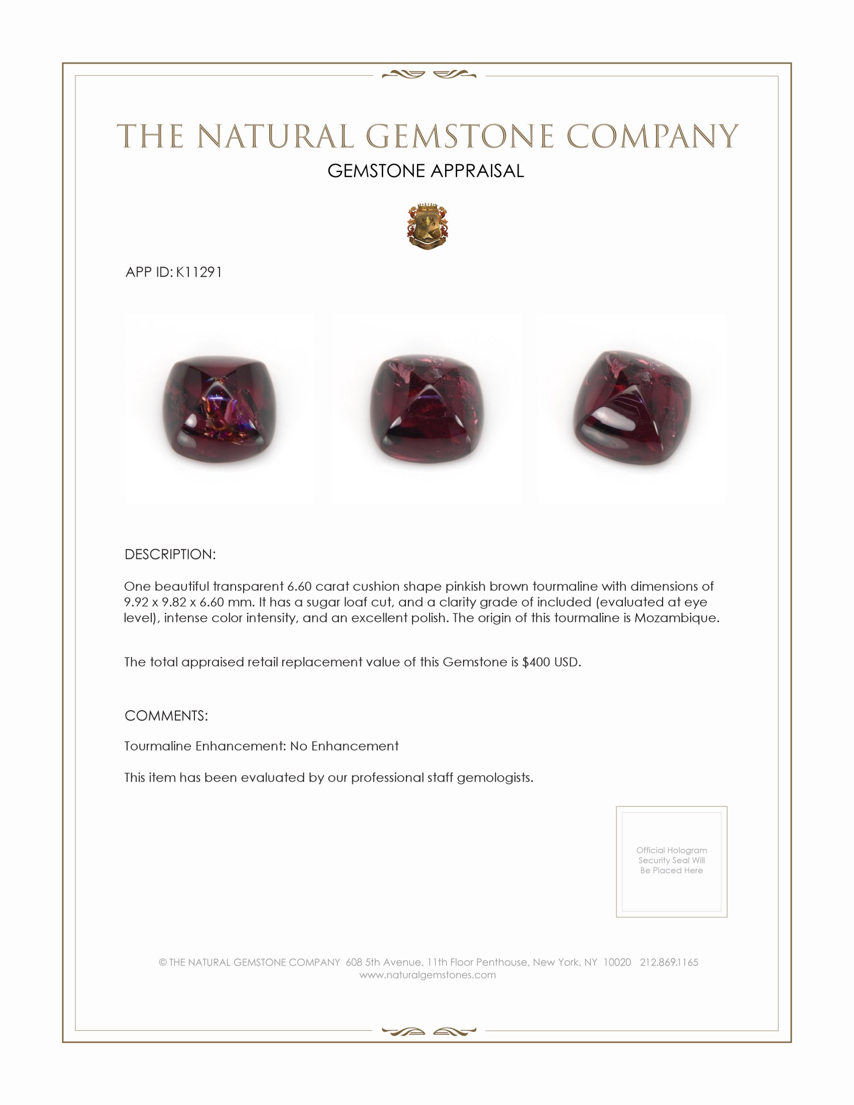 The Natural Gemstone Company proudly presents a stunning 6.60 carat cushion-shaped pinkish brown tourmaline, sourced from the renowned gemstone mines of Mozambique. This exquisite piece, measuring 9.92 x 9.82 x 6.60 mm, represents a remarkable blend of nature’s artistry and human craftsmanship. Cut into a distinctive sugar loaf shape, the tourmaline showcases an almost sculptural elegance, transforming raw stone into a gem of striking allure. Its excellent polish enhances the gem’s visual appeal, providing a flawless reflection on its surface that rivals its peers in the colored gemstone market.