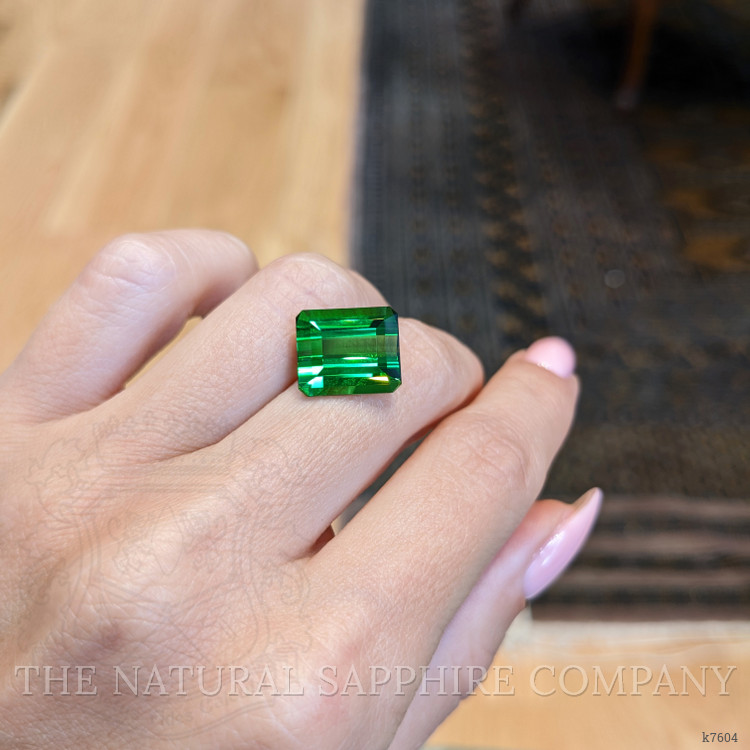 Introducing an exquisite piece from The Natural Gemstone Company, a stunning 8.16 carat emerald cut green tourmaline that promises to captivate even the most discerning gemstone connoisseur. This remarkable gemstone measures an impressive 12.53 x 10.70 x 7.19 mm, offering a substantial coverage that enhances its visibility and presence. The tourmaline is meticulously cut into an emerald shape, a style known for its elegance and ability to highlight the stone’s color and clarity to perfection. The precision of this cut, combined with exceptional craftsmanship, results in a gemstone that personifies beauty and luxury.