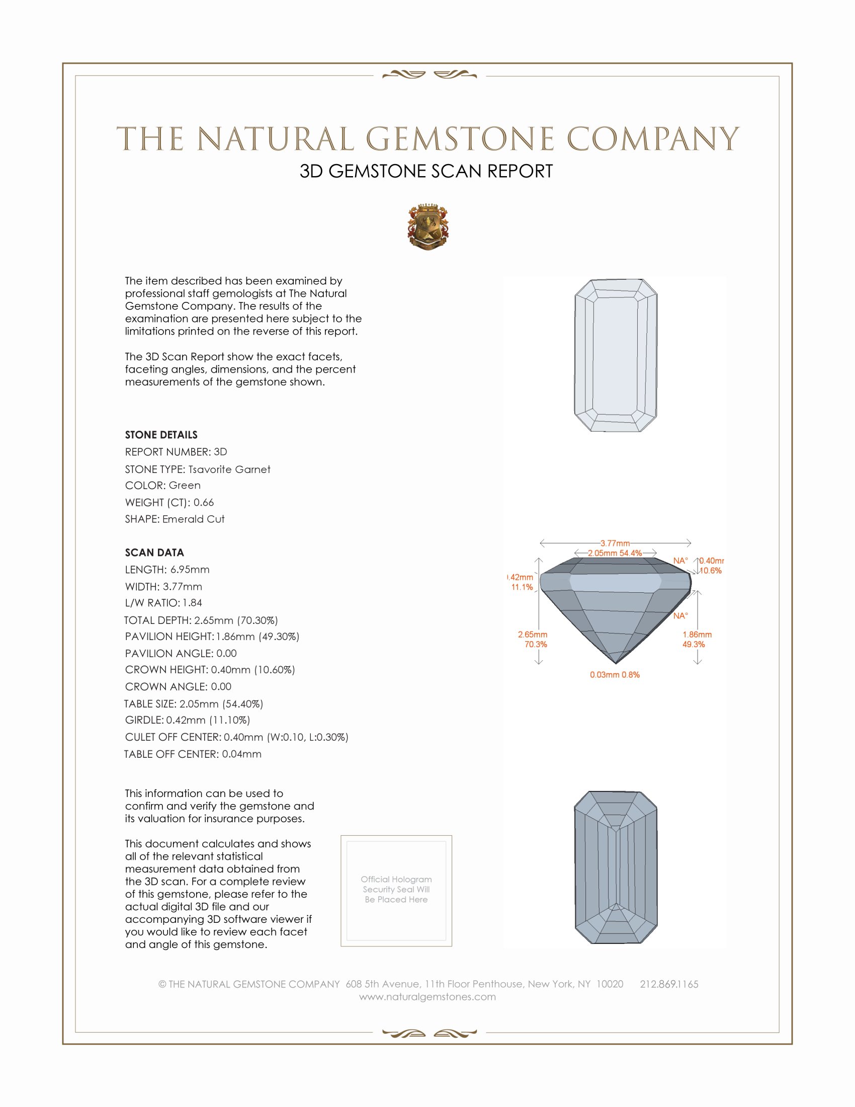 Under the skilled touch of a master craftsman, the stones are refined into their elegant emerald cut shape, measuring precisely 6.95 x 3.77 x 2.65 mm and 6.94 x 3.87 x 2.64 mm. This transformation requires not only technical precision but also artistic vision. Achieving the perfect medium light color intensity is a delicate process, ensuring that the natural beauty of the tsavorite shines through with an unmatched luminescence.