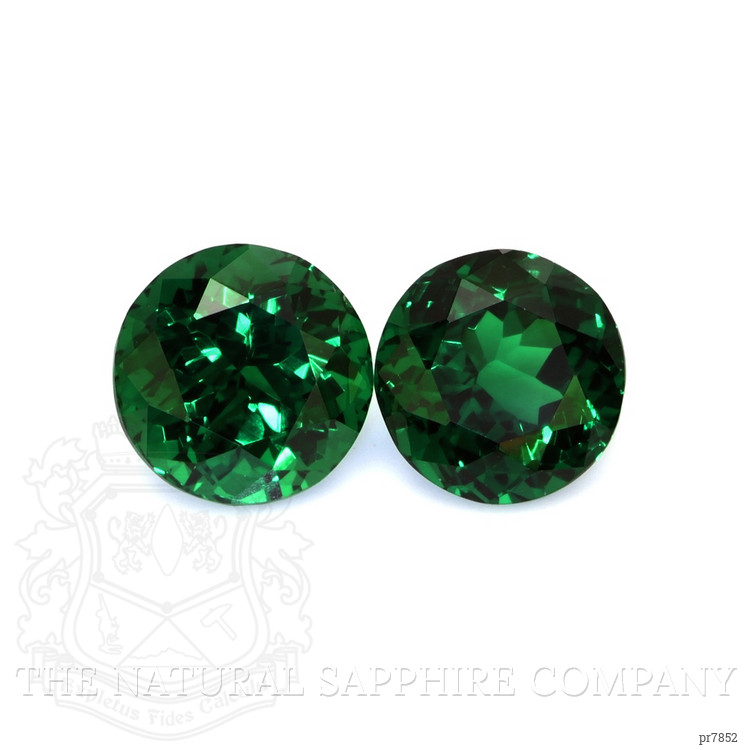 In the heart of Tanzania, amidst verdant landscapes and fertile earth, a marvel of nature forms over millennia—tsavorite garnets of unparalleled beauty. These exquisite gems, weighing 5.46 and 4.35 carats, capture the splendor of nature's artistry with their transparent glow and vivid green hue. Each gemstone, round-shaped and meticulously cut with a mixed brilliant design, measures precisely 10.35 x 10.23 x 7.39 mm and 10.10 x 9.86 x 5.93 mm. Their clarity, evaluated at eye level, is eye clean, ensuring that they remain unmarred by the passage of time, much like the serene depths of a tranquil forest.
