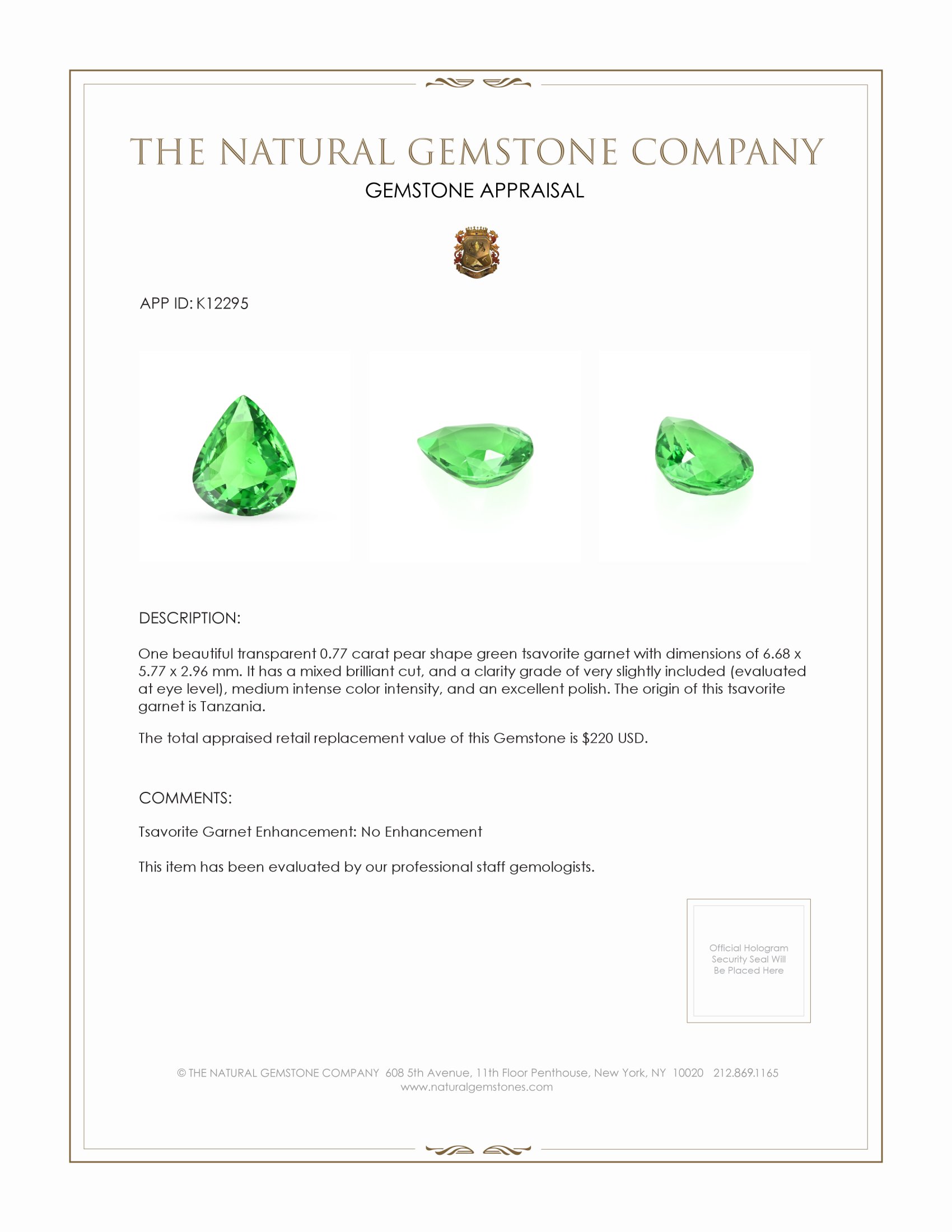 Borne from the heart of Tanzania's enchanting landscapes, this exquisite green tsavorite garnet is a testament to nature's extraordinary artistry and The Natural Gemstone Company's dedication to timeless beauty and meticulous craftsmanship. Its alluring 0.77 carat weight evokes the tender stirrings of a dream captured in stone, whispering tales of Earth’s deepest marvels in every luminous facet. Imagine this pear-shaped treasure nestled into an elegant setting, each glint and gleam mirroring the light of a distant star, transformed into a cherished heirloom passed through generations, as rich in history as it is in color.