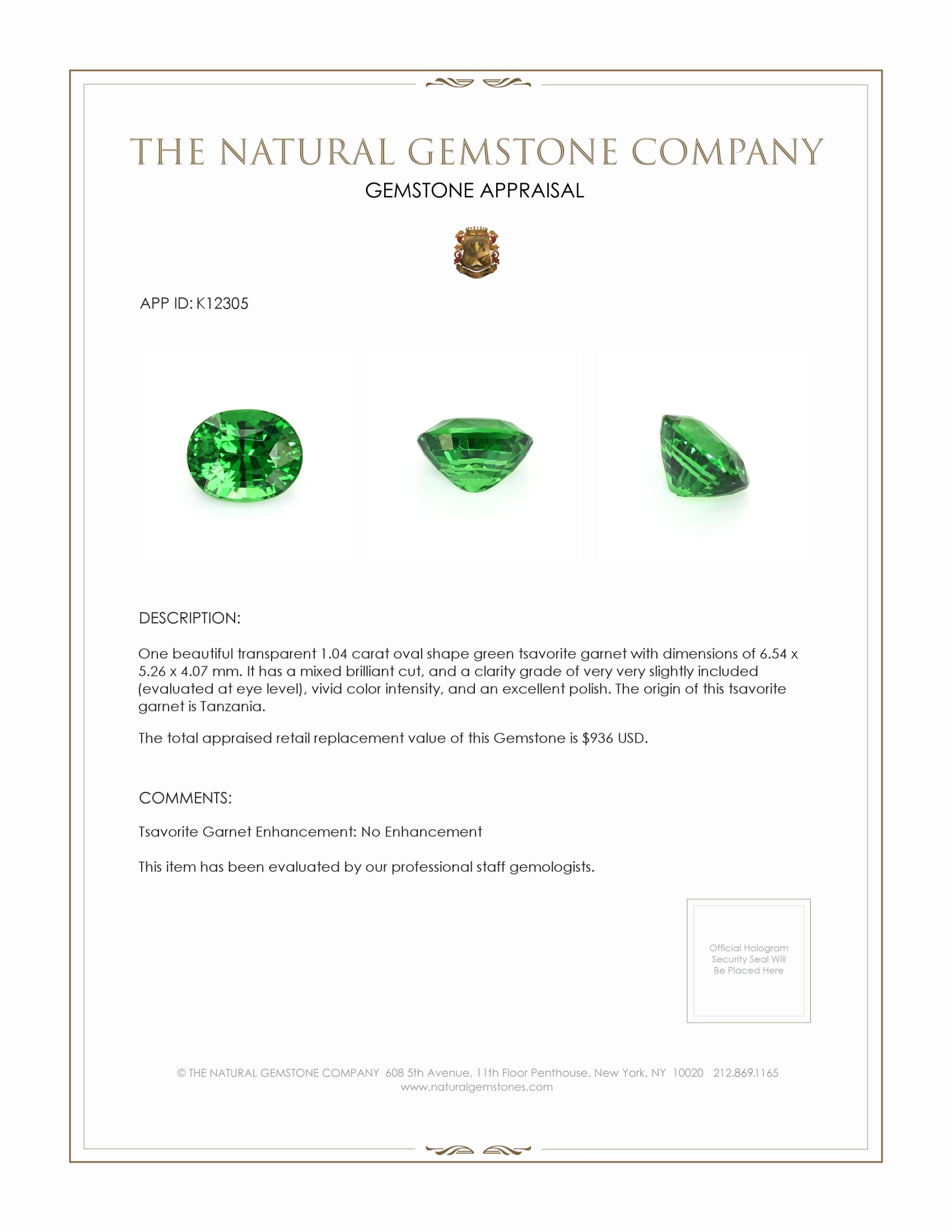 In the vibrant world of gemstones, where beauty is often locked behind questions of authenticity and quality, The Natural Gemstone Company presents a remarkable offering that stands apart: a stunning 1.04 carat oval-shaped green tsavorite garnet. This exquisite gem, sourced from the richly-endowed lands of Tanzania, embodies a level of excellence and elegance that is rare in the market. Its transparent allure measures 6.54 x 5.26 x 4.07 mm, a dimension that ensures it radiates light with extraordinary brilliance through its mixed brilliant cut. With a clarity grade of very very slightly included, evaluated keenly at eye level, this gemstone promises a purity that only the most discerning eyes can appreciate.