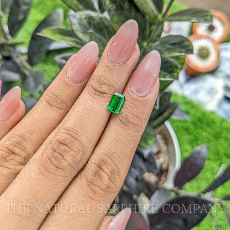 The emerald-cut green tsavorite garnet is a distinguished example of fine gemstone craftsmanship, weighing in at 1.30 carats with dimensions of 8.20 x 5.14 x 3.16 mm. Sourced from the renowned geological formations of Tanzania, this gem captivates the eye with its vivid color intensity, transitioning beautifully in the light to reveal a spectrum of deep green hues. This tsavorite garnet is judiciously cut in an emerald shape which enhances its natural brilliance while preserving its refractive qualities, therefore making it a cherished piece within the gemstone community.
