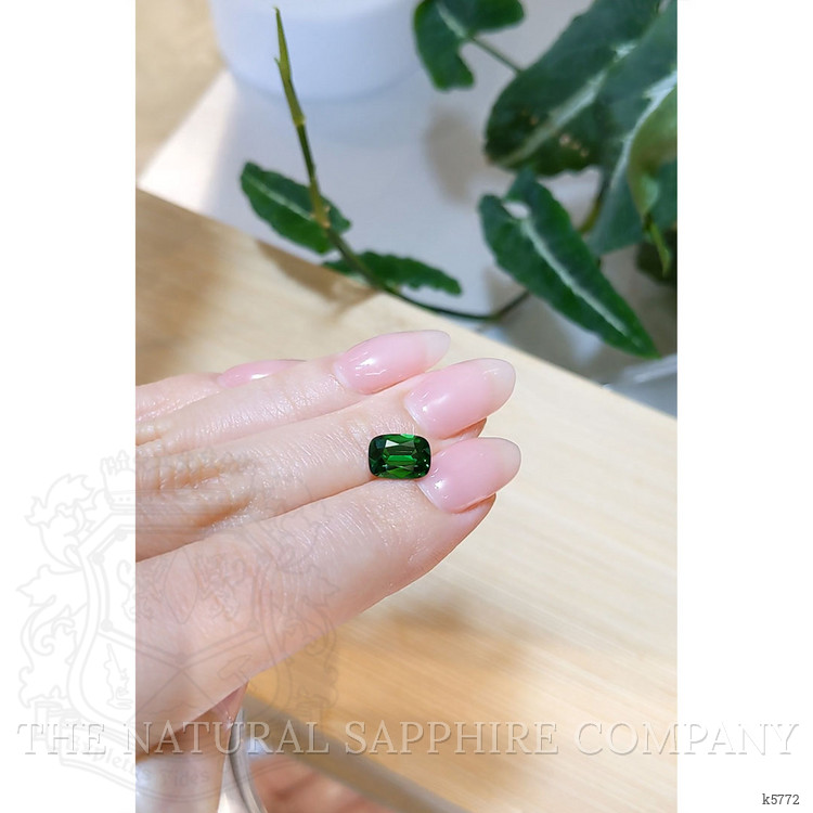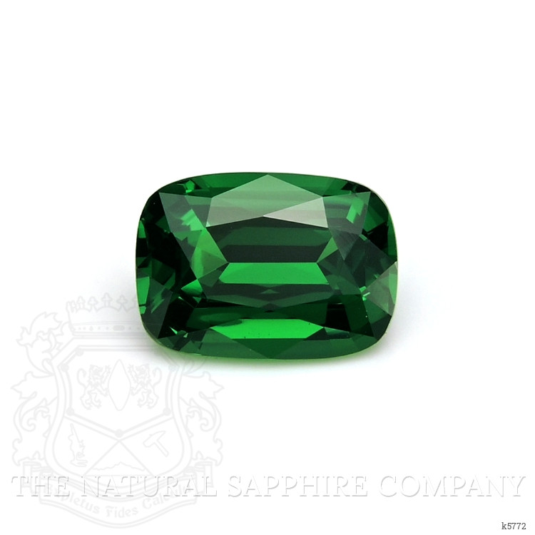 Introducing a breathtaking gem from The Natural Gemstone Company, our exquisite 2.09 carat cushion-shaped green tsavorite garnet offers an exceptional choice for those who cherish the marvels of nature and the mastery of gemstone craftsmanship. With dimensions measuring 8.89 by 6.38 by 4.35 mm, the stone gleams with precision from its expertly executed mixed brilliant cut. Each facet is designed to maximize light reflection, thereby enhancing the gem's inherent beauty and brilliance. Such a meticulous faceting style not only illuminates the gemstone's surface but also deepens its vibrant hue, capturing the eye of the discerning collector or wearer.