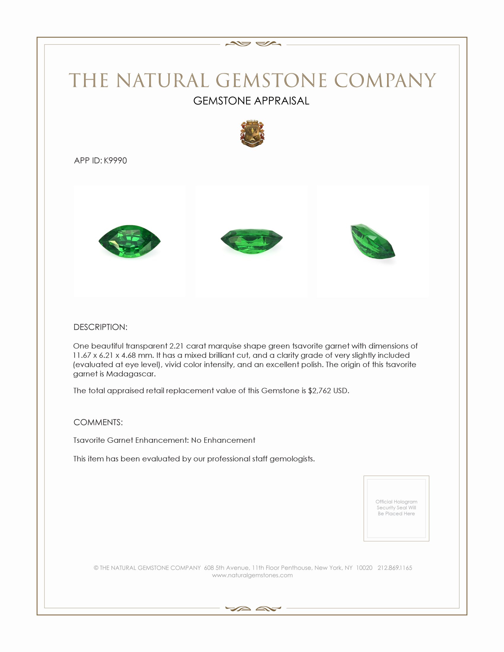 In the heart of a mystical landscape as timeless as an ancient forest, rests a magnificent treasure, one discovered beneath the verdant canopies of Madagascar. This gem, a transparent 2.21 carat marquise-shaped wonder, exudes a charm akin to the whispers of the wind through emerald leaves. With dimensions measuring a sublime 11.67 x 6.21 x 4.68 mm, each facet glimmers, reflecting light like the playful dance of sunlight upon a serene lake. This tsavorite garnet, courtesy of The Natural Gemstone Company, holds within its depths an entrancing story of earthy splendor and enchanting allure, destined to be cherished through the ages.