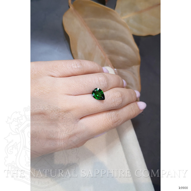 In the heart of the African continent, amidst the ancient landscapes of Tanzania, lies a treasure of extraordinary allure and unmatched beauty. The Natural Gemstone Company proudly presents a truly captivating creation: a stunning 2.41 carat pear-shaped green tsavorite garnet. This exquisite gemstone, with its dimensions of 11.07 x 8.10 x 4.09 mm, embodies a timeless elegance that has been revered for centuries. From its emerald-like hue to its admirable clarity, the tsavorite garnet stands as a testament to nature's artistry, destined to captivate anyone who beholds its splendor.