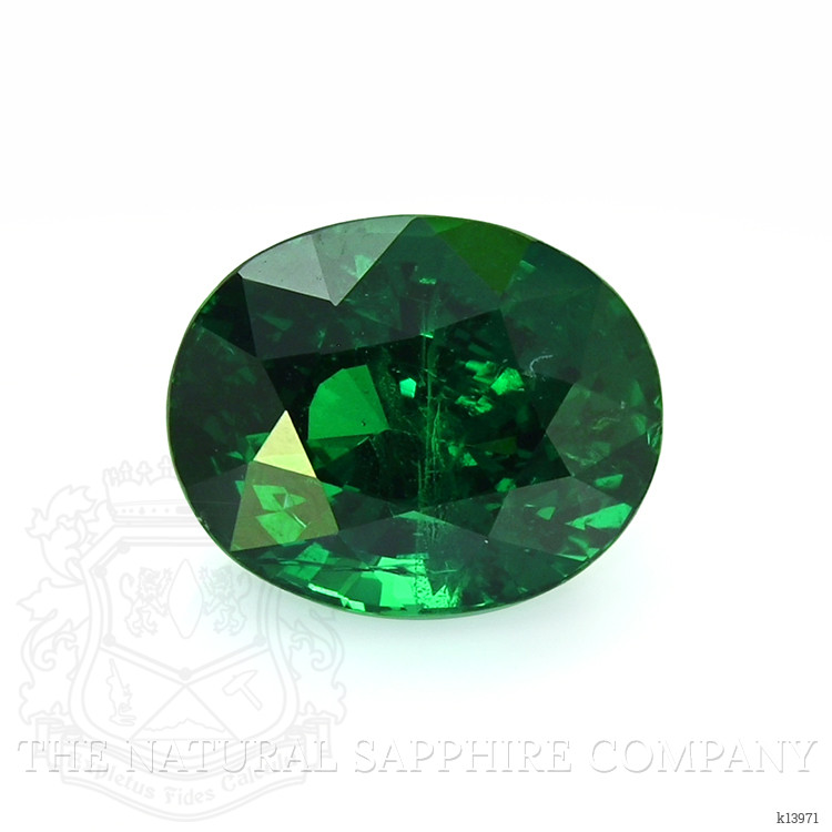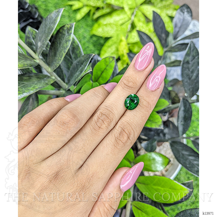 Indulge in the allure of unparalleled beauty with our stunning 5.00-carat green tsavorite garnet from The Natural Gemstone Company. This exquisite gemstone, hailing from the vibrant lands of Tanzania, secures a place of honor in the world of luxury with its breathtaking brilliance and rarity. With dimensions of 11.17 x 9.04 x 6.86 mm, this oval-shaped marvel is not just any jewel, but a piece of nature's artistry captured in its purest form. Its mixed brilliant cut diamonds come alive in a dance of light, evoking a sensation akin to a first love affair between sunlight and the sea, so captivating that it forever etches itself into your memory.