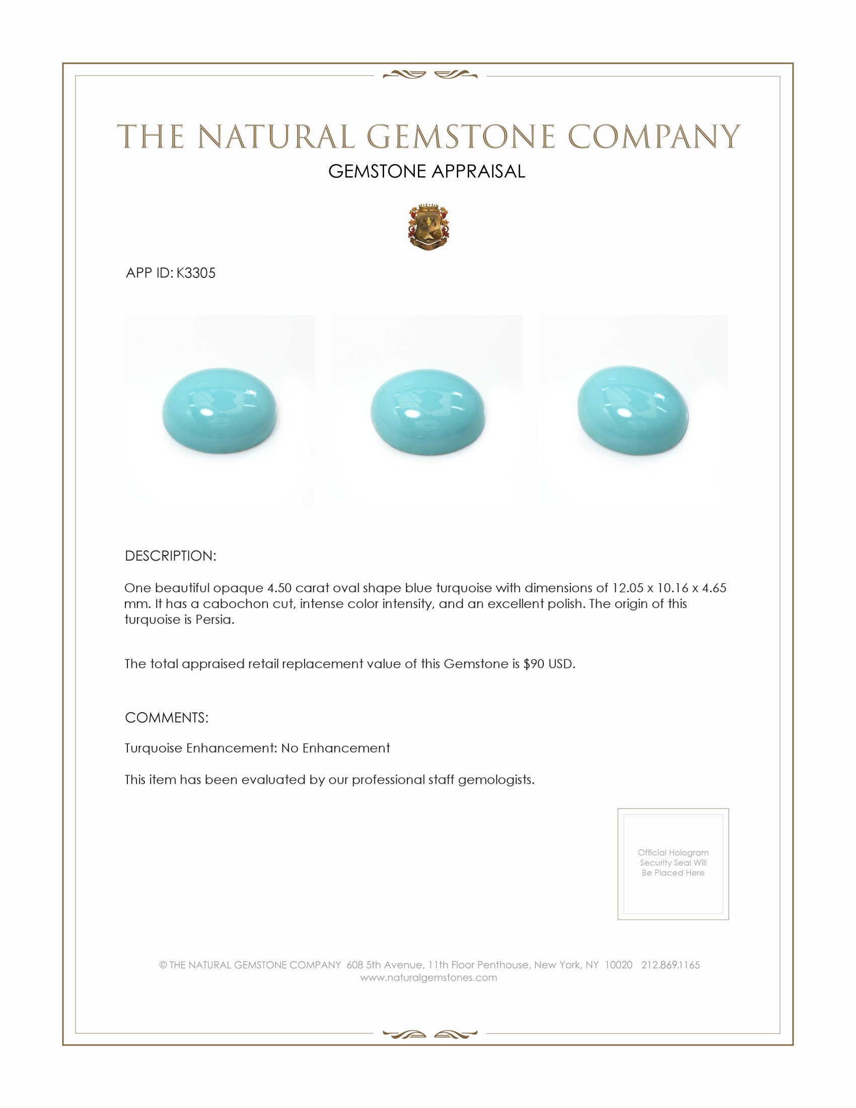 In the heart of an ancient land, where the sky kisses the earth and whispers of timeless love embrace the air, was born a gem of rare beauty. This exquisite 4.50 carat blue turquoise, tenderly crafted by nature, offers an eternal promise carried from Persia to your heart. At The Natural Gemstone Company, we bring to you a piece of this enchanting world—a treasure kissed by the cerulean hues of tranquil nirvana, embodying dreams and fervent vows of love.