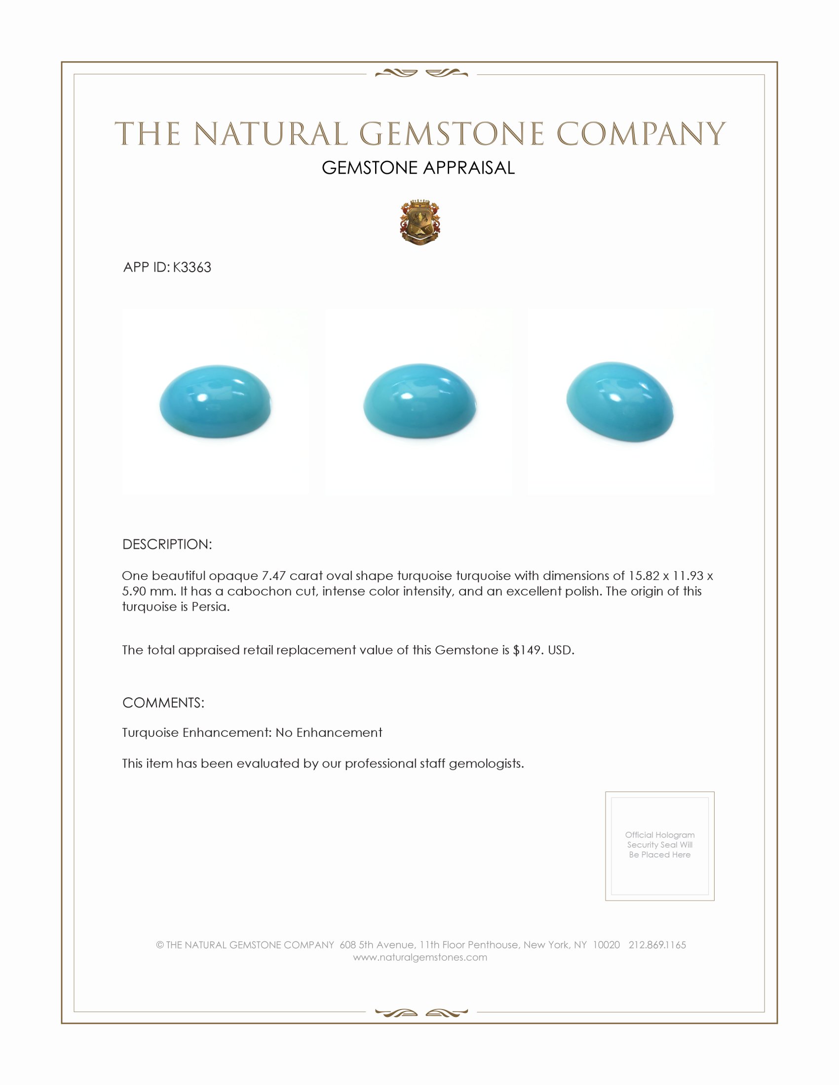 This particular product is a stunning example of high-quality turquoise. The gemstone is a generous 7.47-carat piece with a timeless oval shape and measures 15.82 x 11.93 x 5.90 mm. Its significant size makes it an eye-catching centerpiece for a variety of jewelry settings. The material itself is the esteemed Persian turquoise, known for its unparalleled color and history of use in some of the world's most exquisite jewelry pieces.