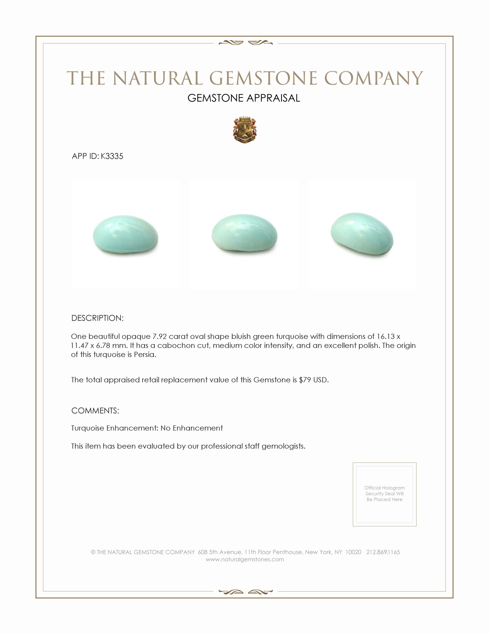 As the turquoise is gently unearthed, its raw form is witnessed with awe. Unlike many of its peers consumed by commercialization without thought, this particular gemstone is carefully selected for its exemplary origins and distinctive hue. Cloaked in an exquisite veil of bluish green, reminiscent of serene Persian gardens and celestial panoramas, its beauty harkens back to a bygone era. Measuring 16.13 x 11.47 x 6.78 millimeters and weighing a substantial 7.92 carats, this unique piece with its oval shape presents a canvas that skilled hands can shape without diminishing its natural splendor.