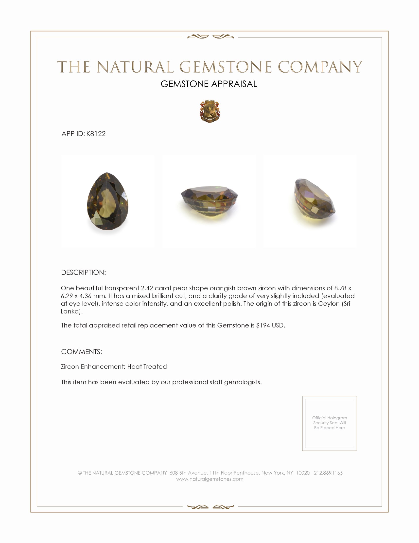 The Natural Gemstone Company upholds a standard of excellence through its dedication to sourcing and curating stones that meet the highest criteria of color, clarity, and craftsmanship. This orangish brown zircon is not just an acquisition but an investment in everlasting beauty and unparalleled elegance for collectors who understand the nuanced subtleties of fine gems. A true testament to nature's artistry, this zircon stands ready to augment your collection with its unique charm and timeless appeal.