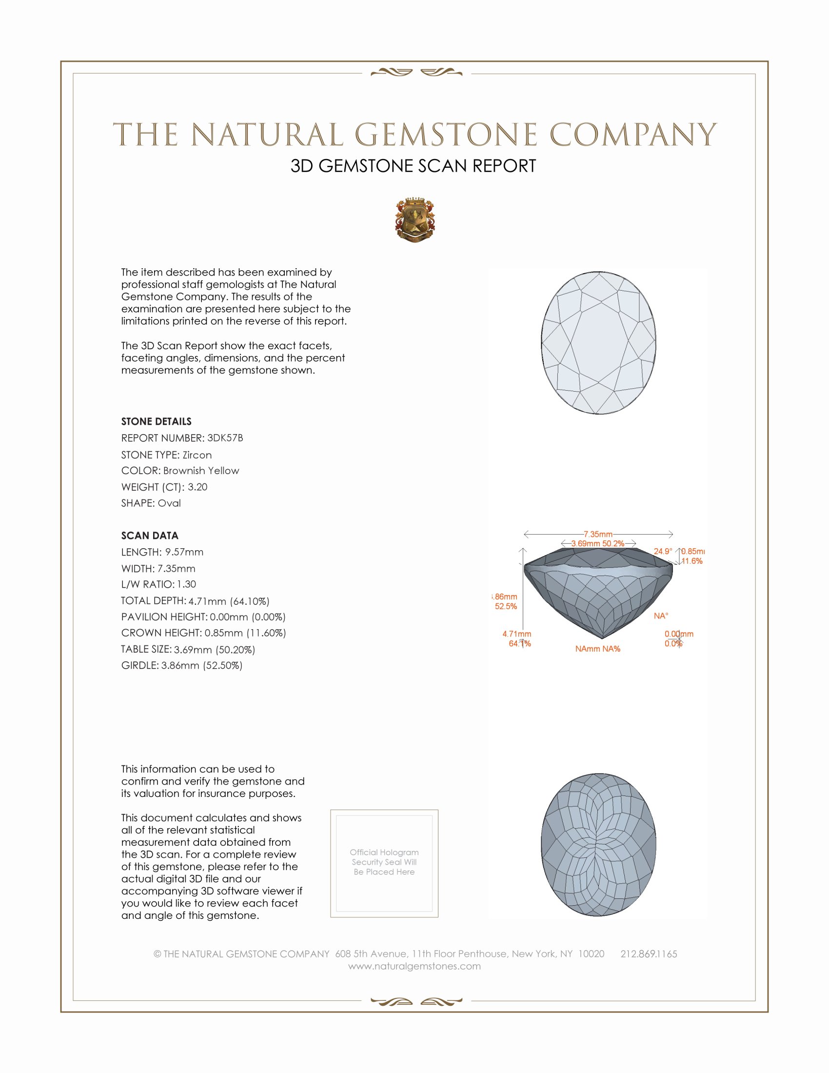 Imagine gifting or owning a gem that is as rare and exquisite as the most cherished memories. The Natural Gemstone Company invites you to feel the unparalleled joy and warmth that our transparent 3.20 carat oval shape brownish yellow zircon will add to your life. With dimensions of 9.57 x 7.35 x 4.71 mm, this gem does more than sparkle; it tells a story. An embodiment of deep emotions and the joy of rare treasures, this gemstone captures the wonder of life's most radiant moments. Can you imagine the awe it inspires, akin to discovering a surprise that takes your breath away? Whether it is a significant gift for someone you love or a new addition to your cherished collection, this zircon is more than a stone; it's an heirloom in the making.
